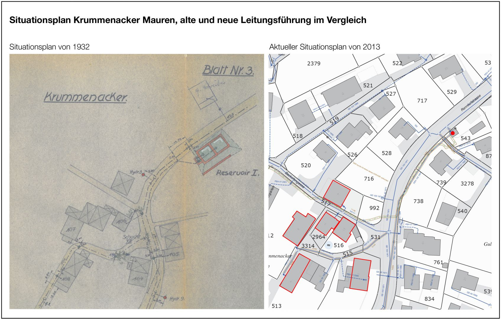 Früher wurden die Leitungen von Hand mit dem Messband und dem Meter auf Gebäudeecken und Grundstücksgrenzen eingemessen und mittels Tusche auf Transparentpapier aufgetragen. Flächendeckende Grundbuchpläne für den täglichen Gebrauch gab es nicht. Anhand des nachstehenden Beispiels der Situationspläne im Krummenacker in Mauren von 1932 und 2013 können die Unterschiede in der Darstellung und der Datenqualität etc. eindeutig festgestellt werden. Die rot umrandeten Gebäude auf dem Plan von 2013 sind auch im alten Situationsplan von 1932 zu erkennen.